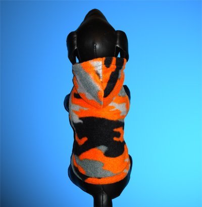 This nice quality Orange Camoflauge fleece hoodie is perfect for those days that are meant for hunting or "pretend hunting." The fleece has a leash opening and is machine washable. X Tiny - Teacup Tiny 1-3 lbs XXSmall 2 - 6 lbs X Small 5 - 12 lbs Small 12 - 20 Medium 18 - 30 lbs Large 28 - 46 lbs X Large 40 - 70 lbs XX Large 70 - 110 Pictures will be posted soon. Models can be so booked up for photo sessions! Examples of other fleece hoodies are listed below.